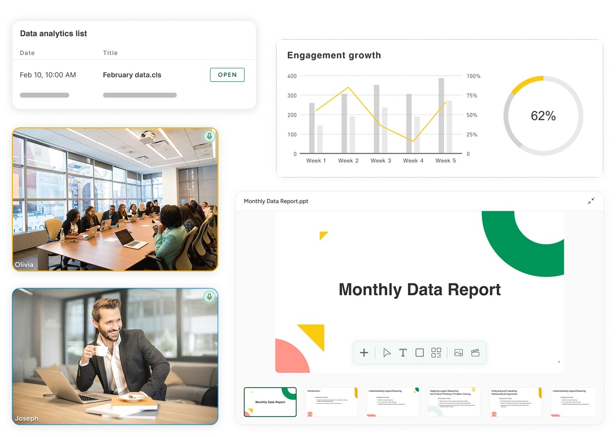 Built-in engagement mechanics ensure sessions are effectively interactive and measurable, not passive video calls.