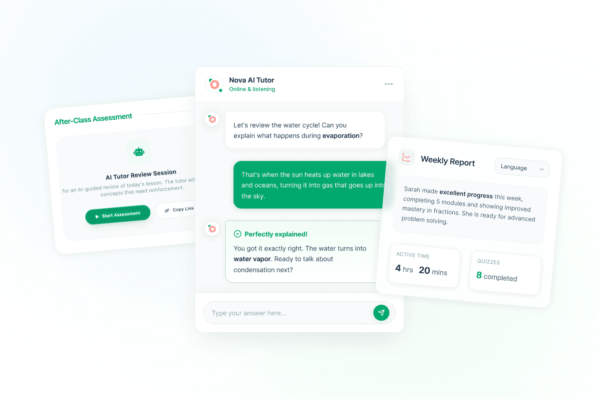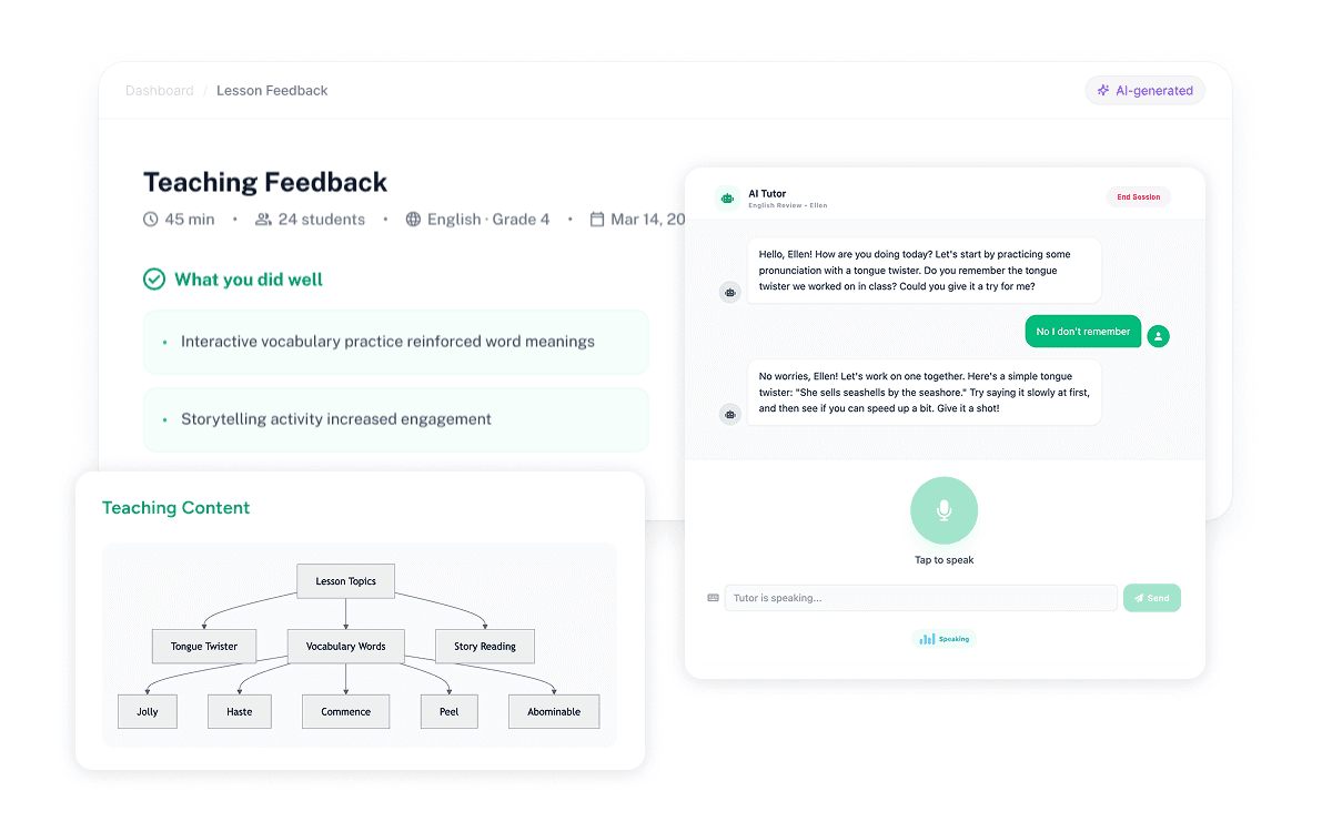 HiClass gives students access to a voice-enabled AI tutor after class, built from the content of that specific lesson. The tutor asks questions, listens to responses, and helps reinforce understanding while the material is still fresh. A follow-up report is generated at the end of the session, showing which concepts moved from partial to full understanding and which ones still need work.