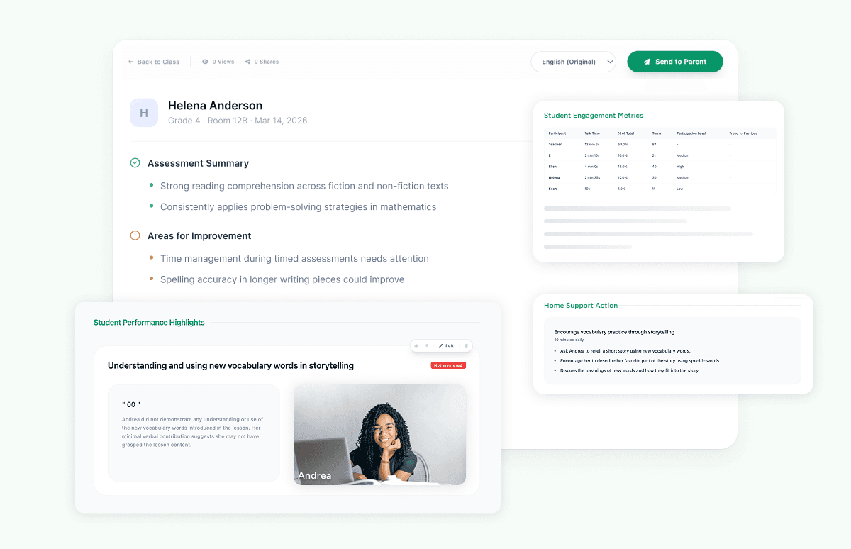 The result is that parent communication goes from a time-consuming obligation to a two-minute task, and the conversations that follow are grounded in evidence, not reassurance.