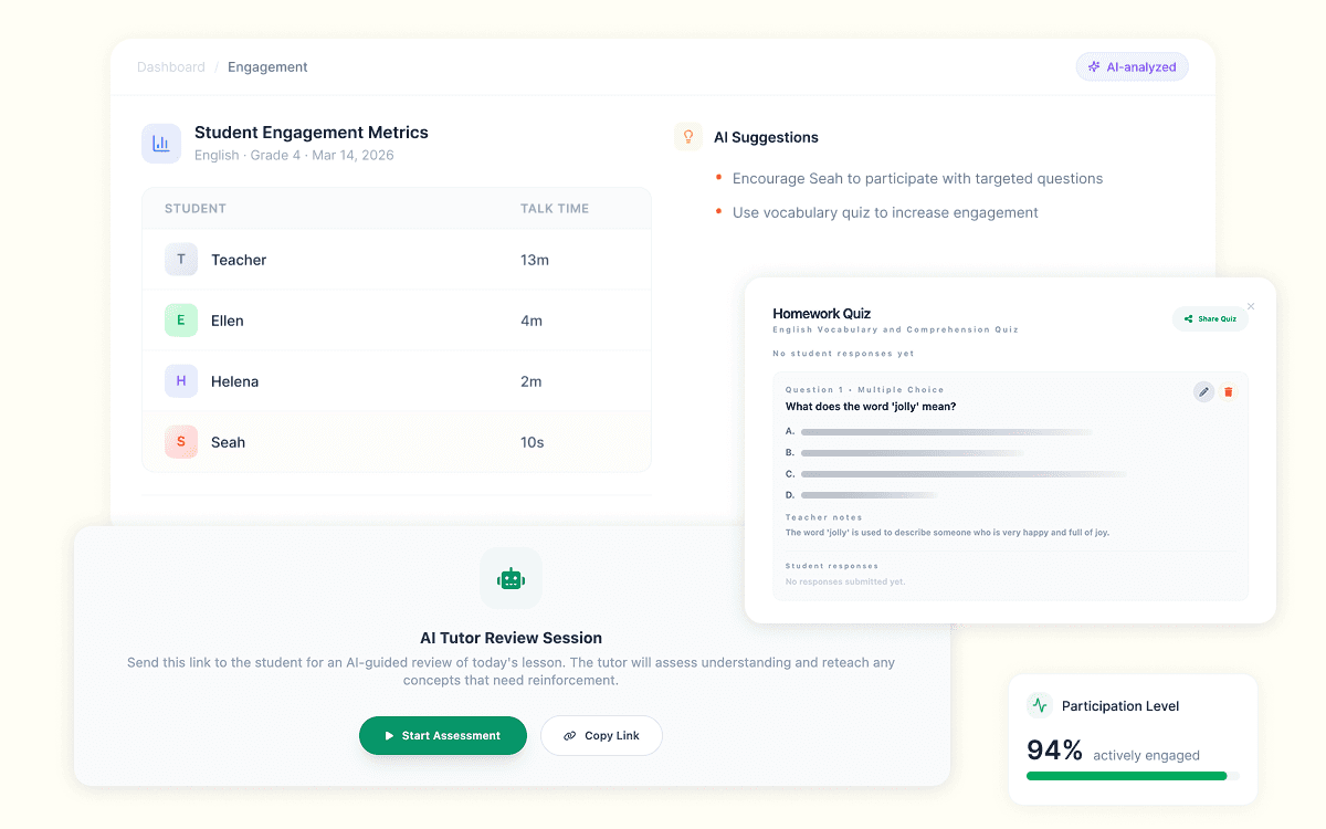 HiClass generates multiple-choice and fill-in-the-blank quizzes directly from the lesson transcript. Teachers can adjust the format and question count, share via link, and track student responses in real time as they come in.